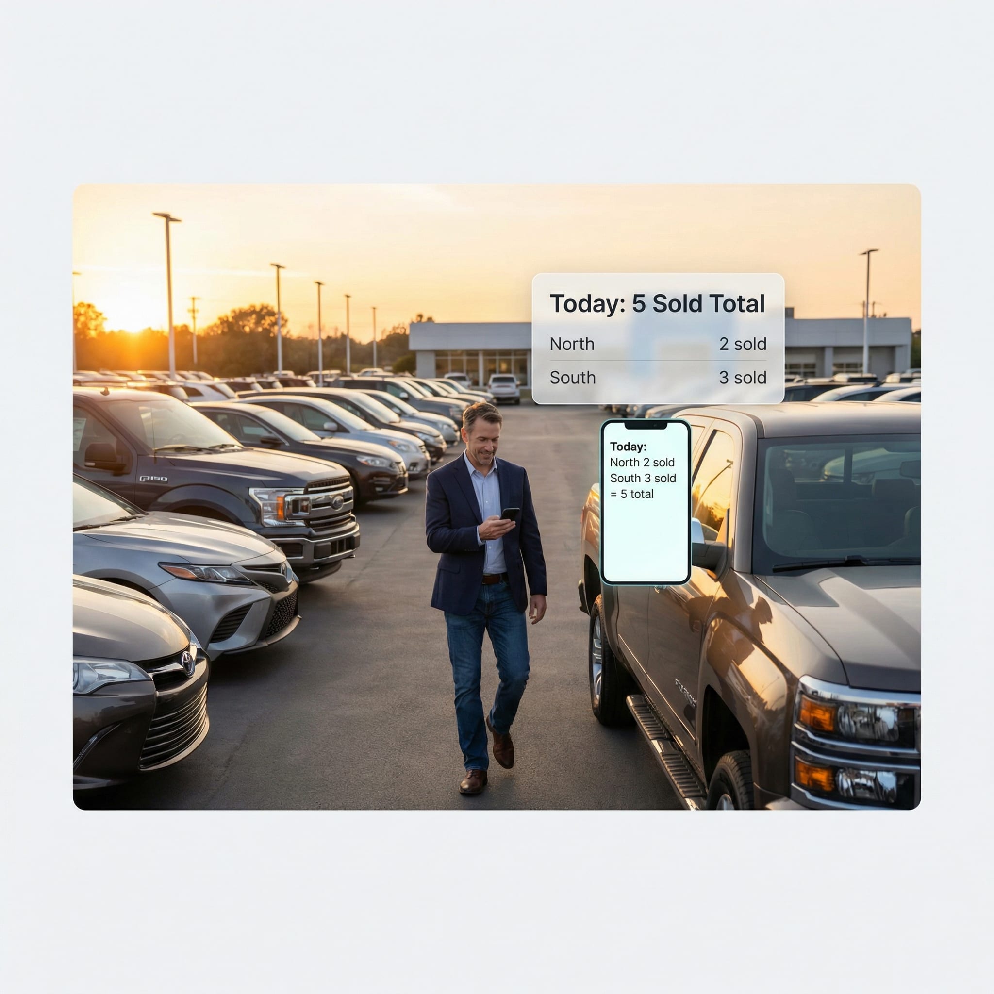 One dashboard shows all locations. Sales, leads, inventory—every lot at a glance.