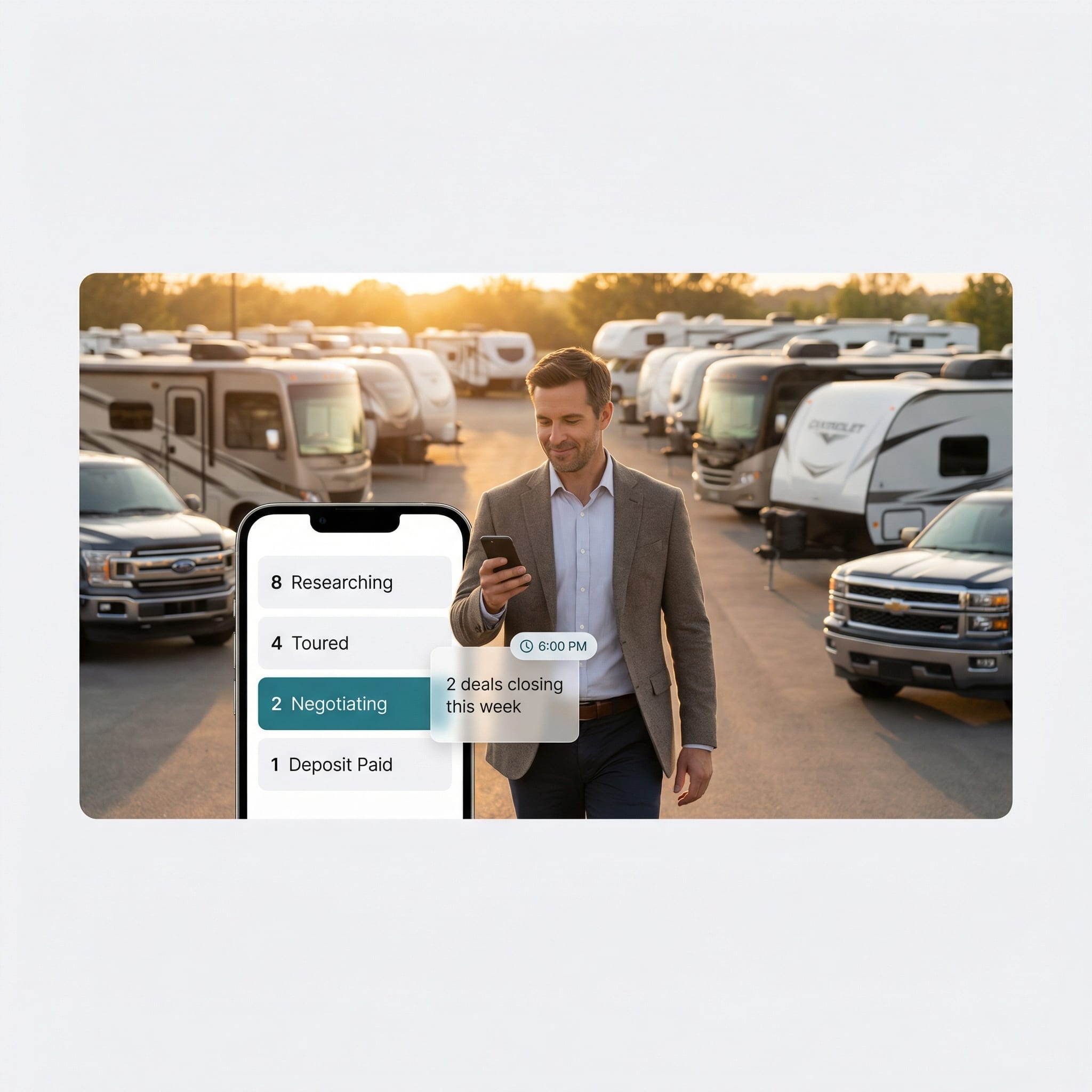 Months of research, complex specs, consignment units, long-term relationships. RV sales aren't like car sales—you need software that handles the nuances.