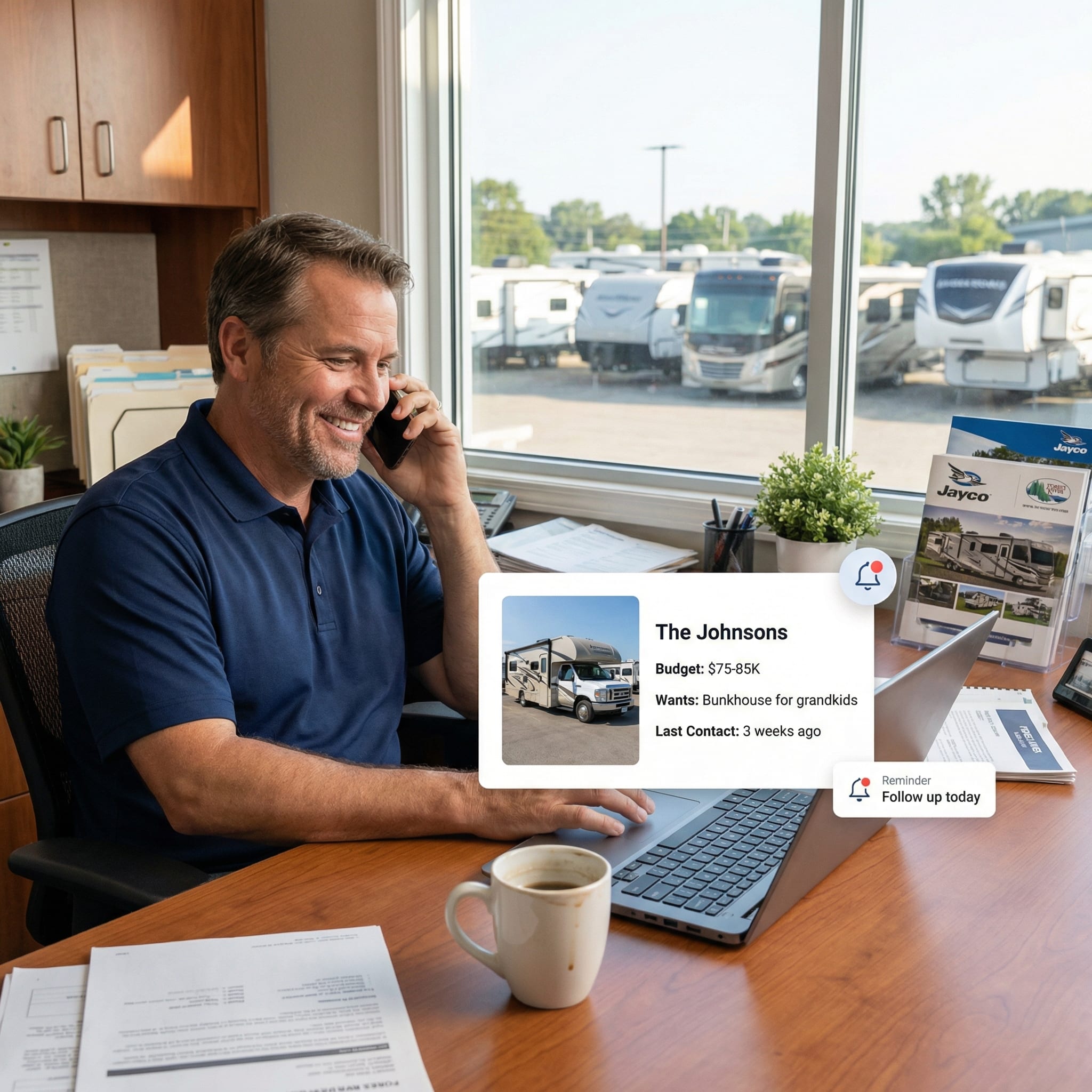 CRM shows every touchpoint. "John—interested in Class C, wife wants bunkhouse. Follow up today."